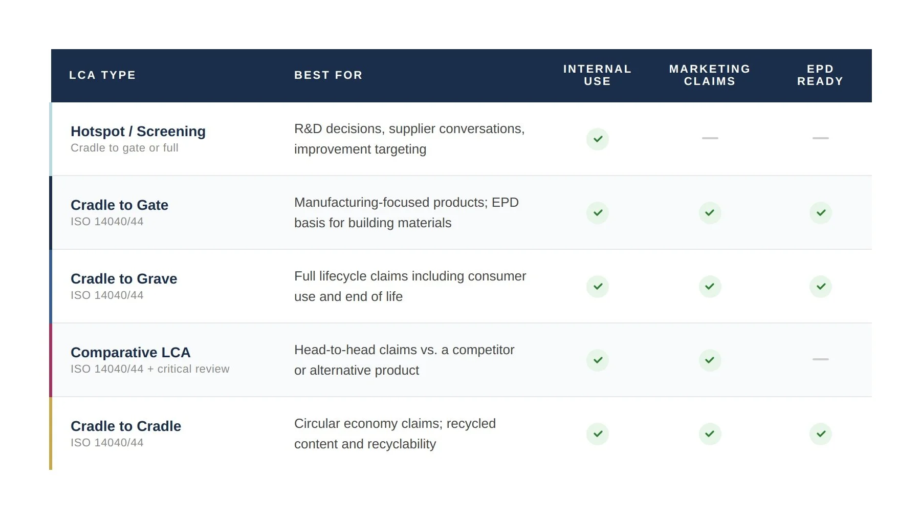 Each LCA type is designed for a specific purpose. Using the wrong one for a marketing claim can create legal liability. Here are the most common study types we conduct.